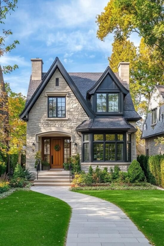 Modern stone cottage villa design by Uttara Architects at Ananta Hills, Dehradun, featuring a sloping roof and landscaped garden.